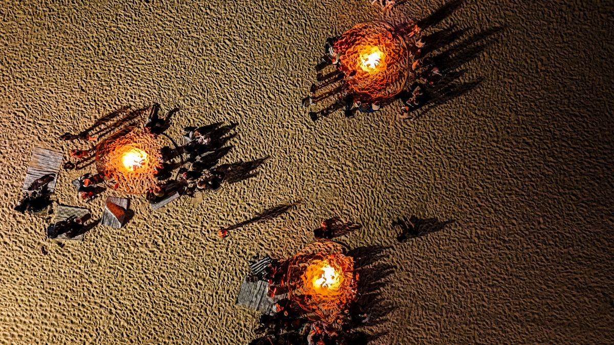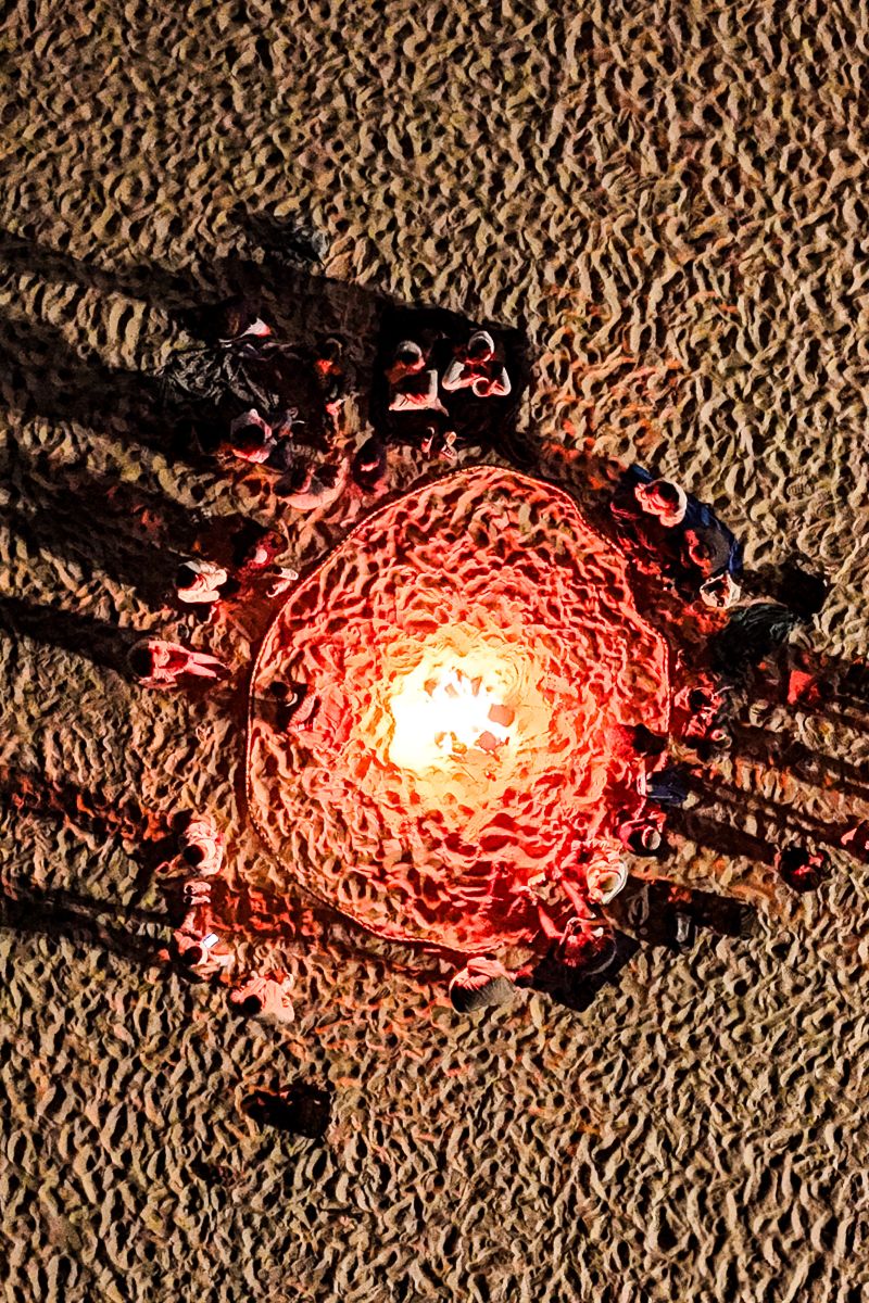 For a few hours, the southern end of the beach glows with flickering firelight. People gather barefoot on the sand, wrapped in blankets, sharing stories, laughter, and quiet moments by the sea.